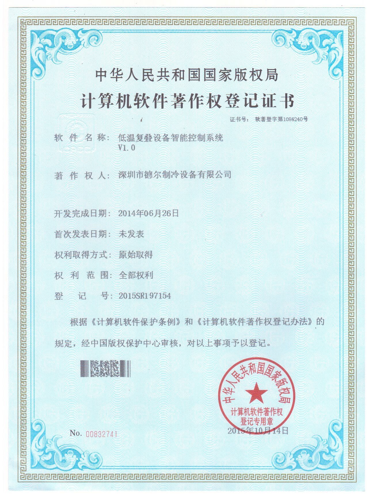 低溫復疊設備智能控制系統(tǒng) 軟件著作權登記證書