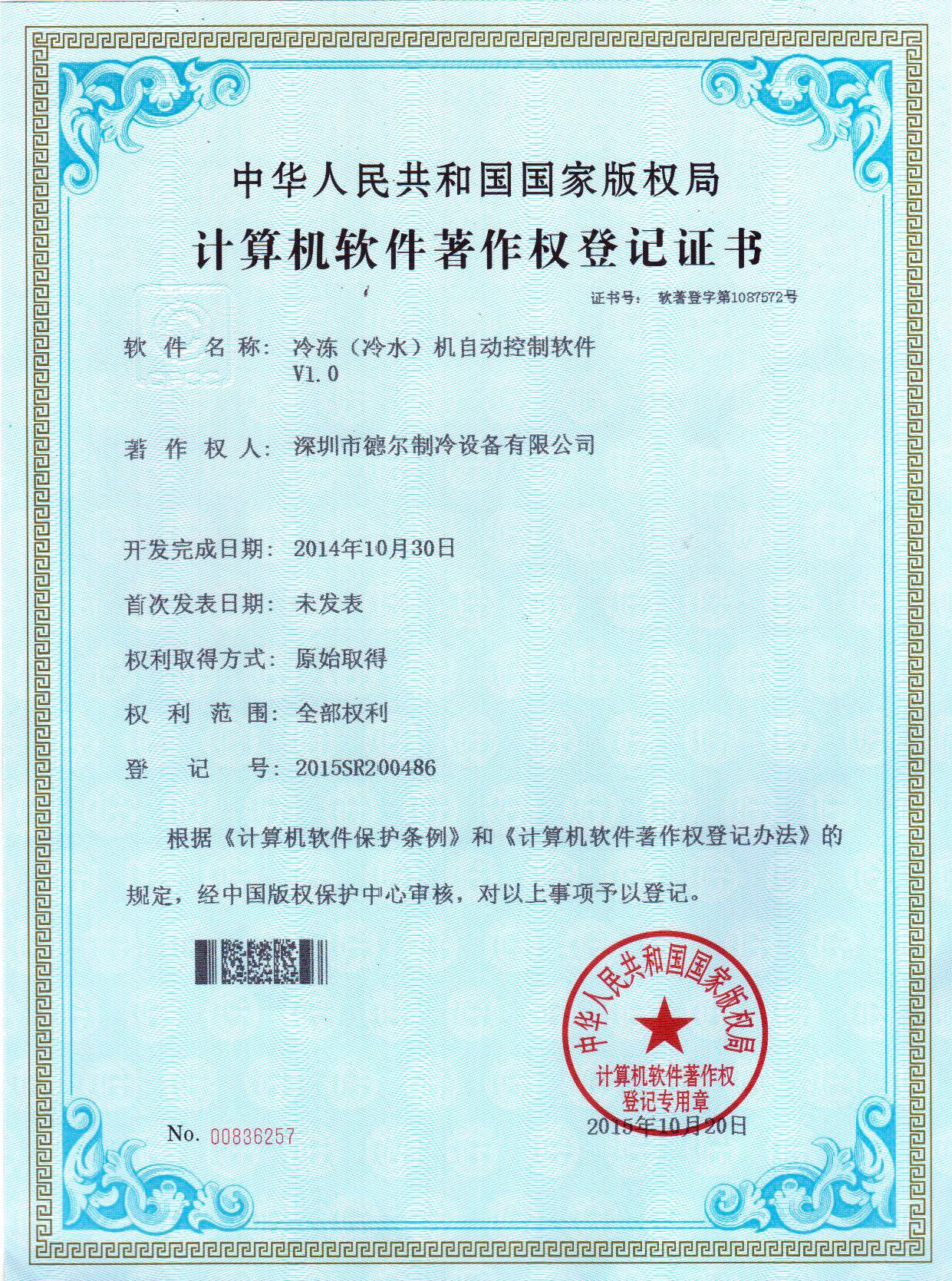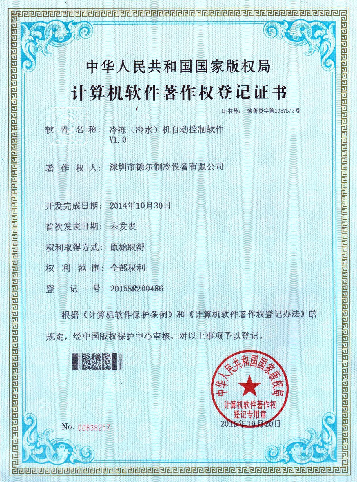 冷凍機組自控系統(tǒng) 軟件著作權證書
