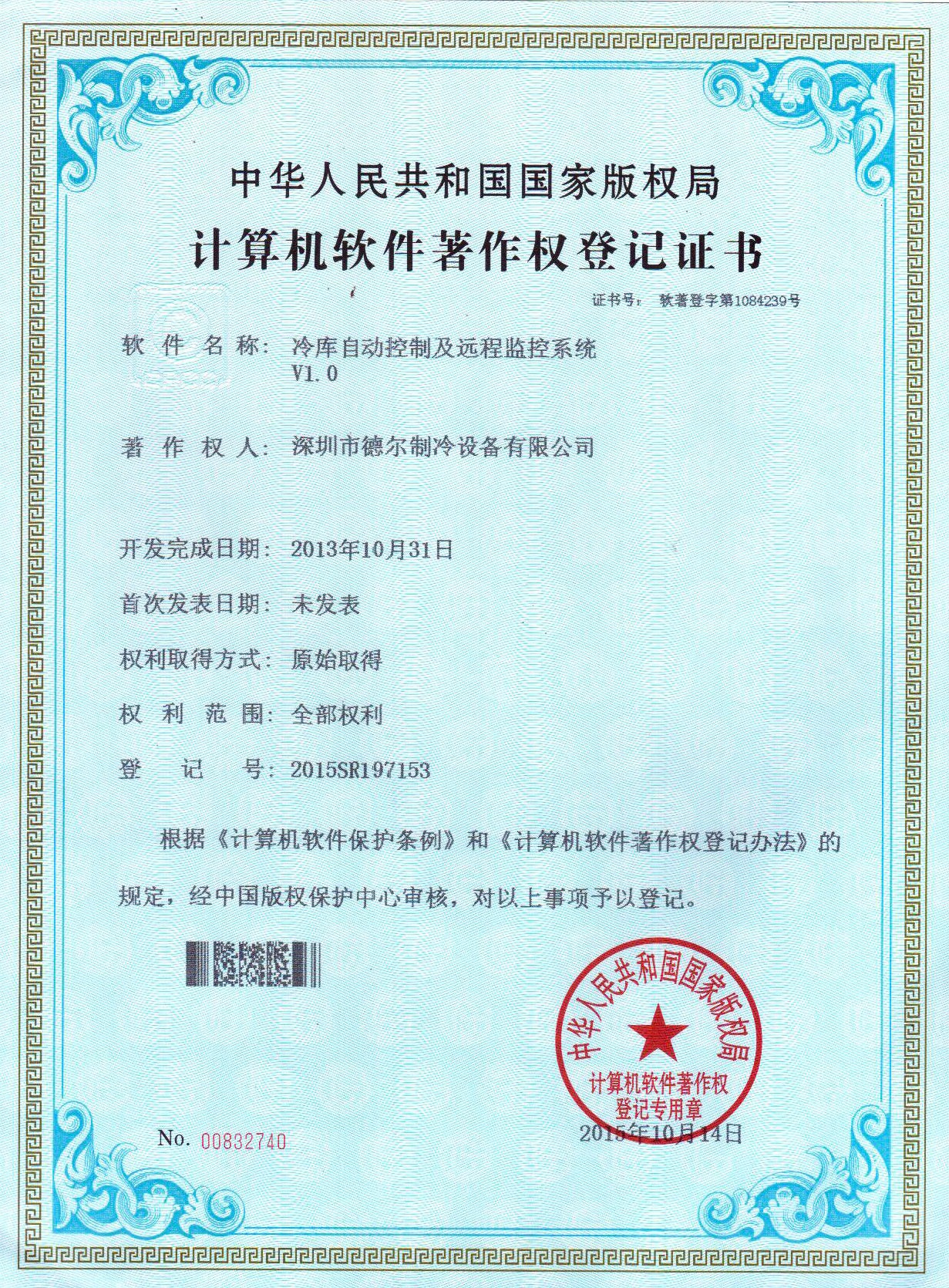 冷庫自動控制及遠程監(jiān)控系統(tǒng) 軟件著作權證書
