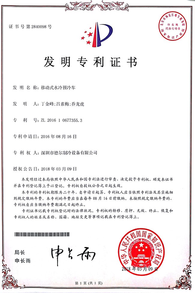 移動式水冷預冷冷車 發(fā)明證書